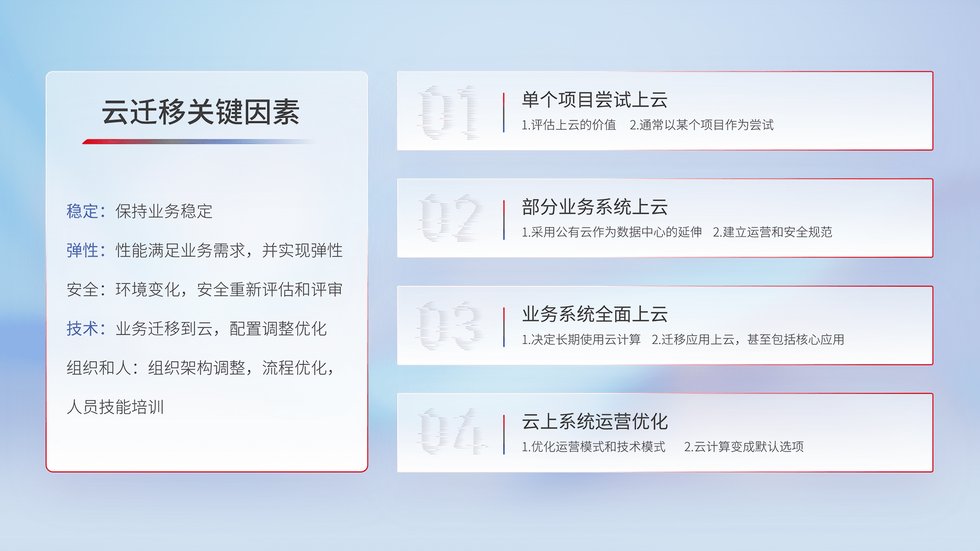 结合实际业务,,,从规划设计、、、、云平台选型、、、、云原生改造、、、、数据迁移、、、、集成交付,,迁移全过程为客户识别最佳上云路径,,,,做好风险识别管理,,,设计网络架构、、身份权限、、、安全审计合规、、操作审计、、、、日志审计、、监控告警策略、、、多站点容灾设计等,,,对云上基础设施进行整体规划,,提升IT治理水平,,以满足弹性、、高可用、、、高性能的需求。。。。